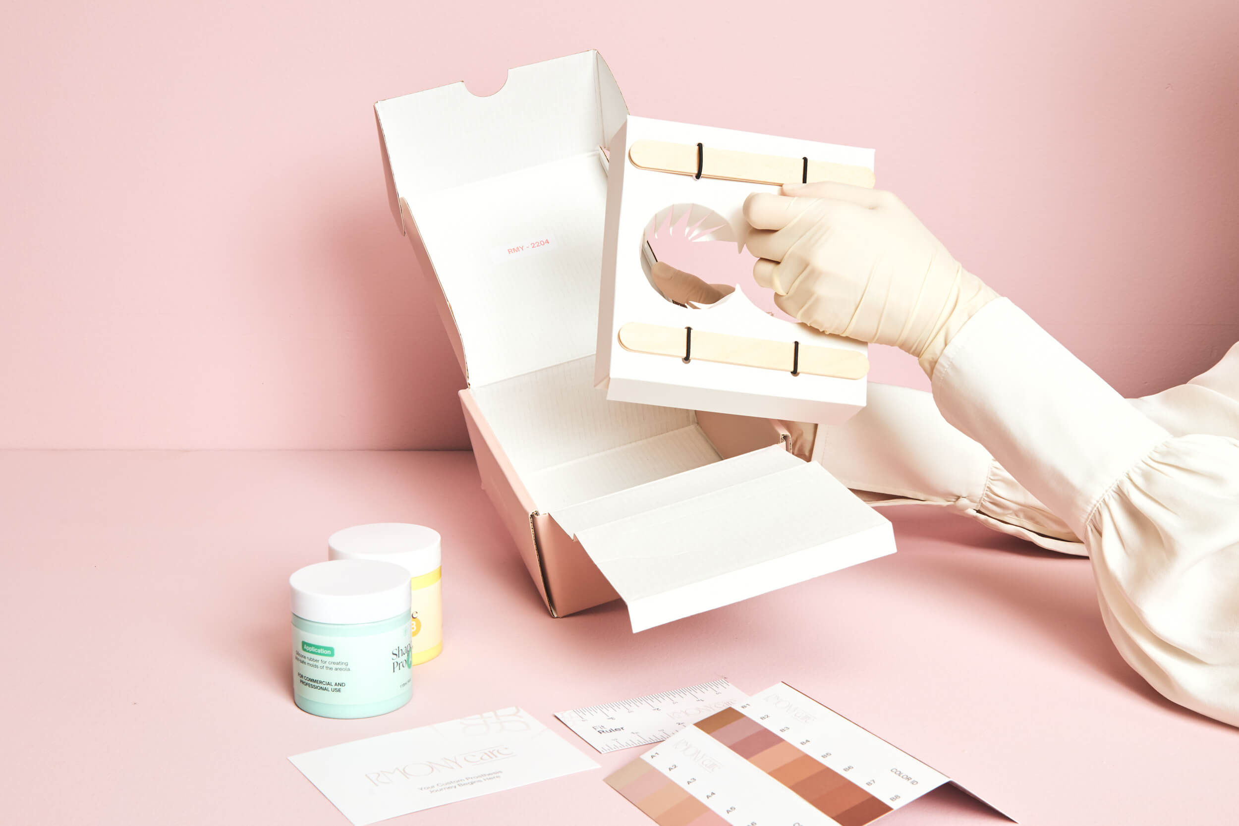Dentro de tu kit encontrarás herramientas, instrucciones y materiales premium para crear dos moldes detallados, medir tu areola y capturar el tono y matiz ideales para una replicación precisa de la prótesis.